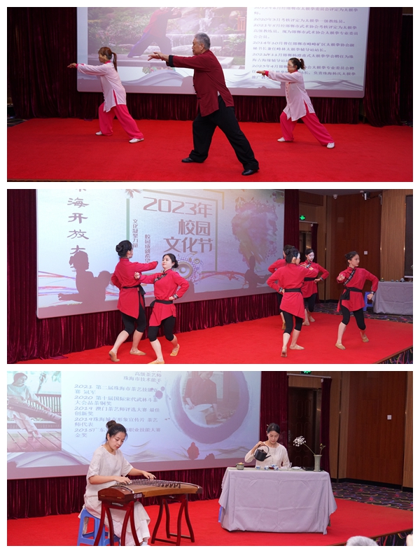 随着主持人热情洋溢的登场,开幕式正式拉开了帷幕。随后分别由中山工贸技工学校教学点的学生舞蹈队与我校特聘培训师、杨氏太极拳第五代传人李湘河老师带来蒙古族舞蹈《希格希日》与杨式太极二十八式的表演,古筝演奏家叶子老师与高级茶艺师齐丹老师的古筝伴奏茶艺同台演出,更是将开幕式推向了高潮,为莅临现场的师生献上一场高雅的艺术盛宴。