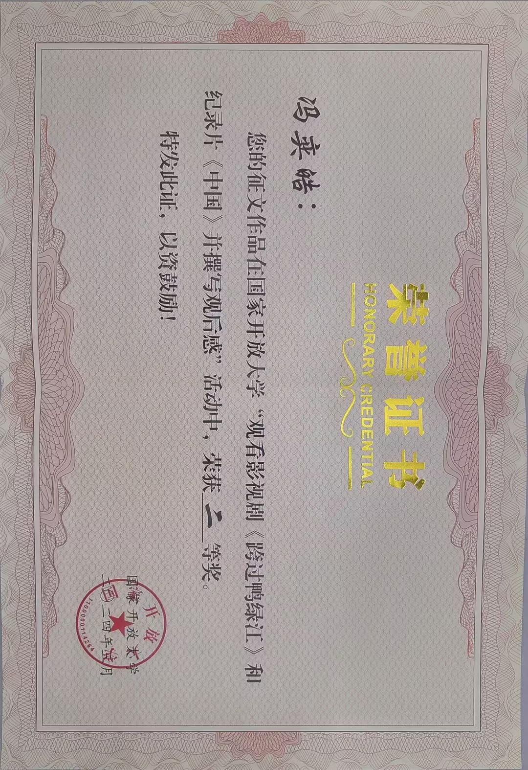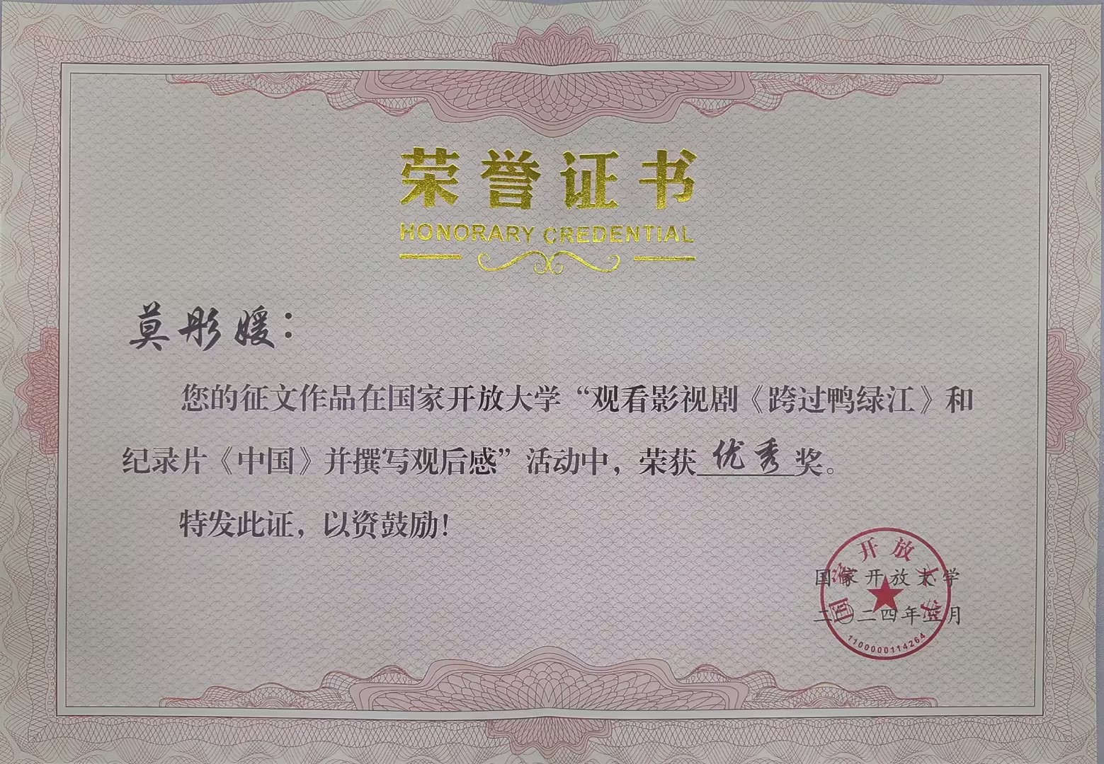 (学生处 报道)近日,国家开放大学组织的观看影视剧《跨过鸭绿江》和《中国》并撰写观后感活动评审结果公布,全国共报送357篇作品,经过初审及专家评审,最终评选出全国一等奖11个、二等奖22个、三等奖35个,优秀奖50个。我校19秋商务英语本科冯奕皓同学获二等奖,20春学前教育本科莫彤媛同学获优秀奖,其中,冯奕皓同学所获奖项是国家开放大学广东分部唯一一个获二等奖及以上名次。