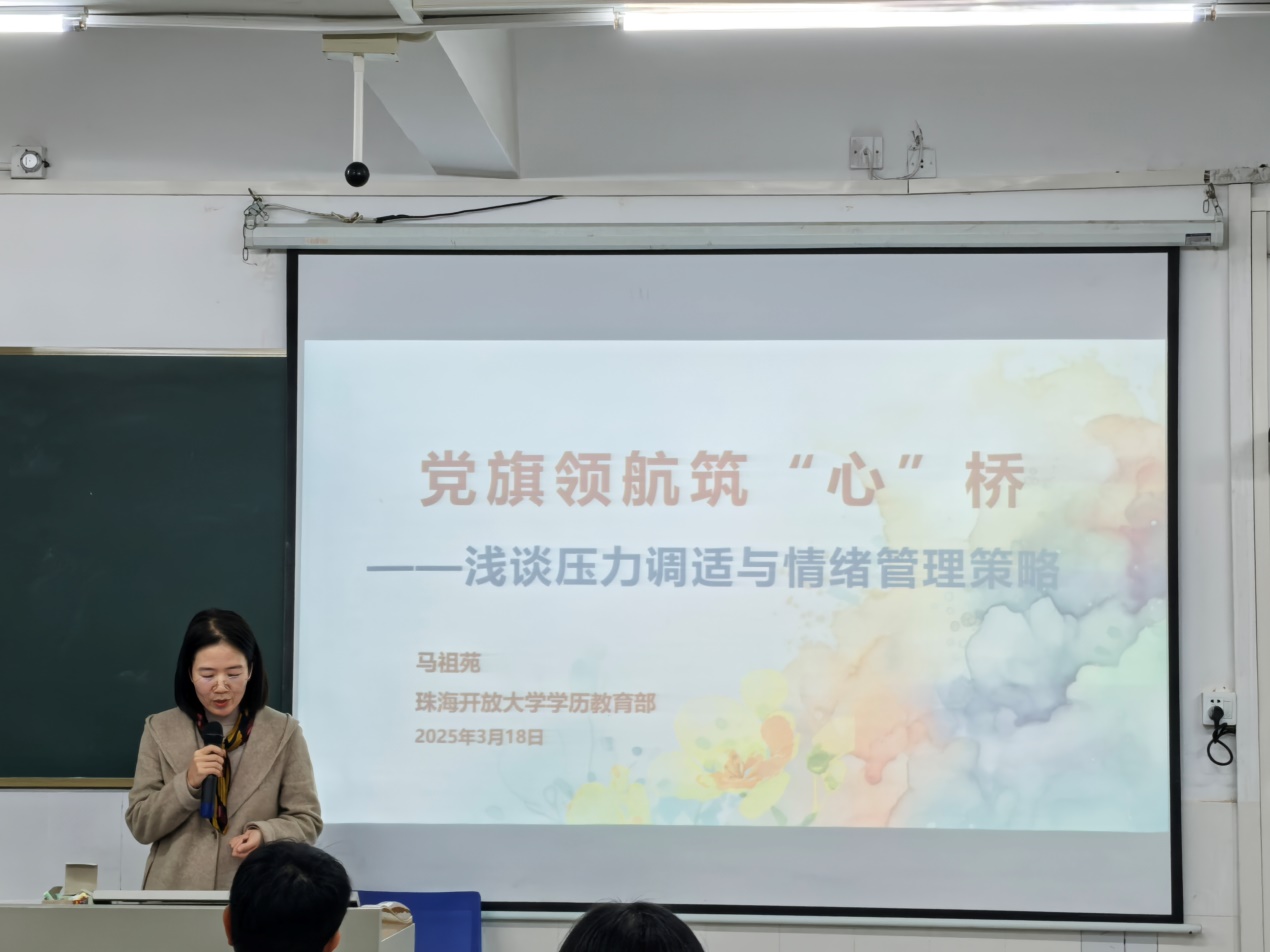 继续教育学院行政第二党支部副书记、学历教育部副主任马祖苑以《党旗领航筑“心”桥——浅谈压力调适与情绪管理策略》为主题给新生讲授了开学第一课,她凭借丰富的经验和深入浅出的讲解方式,将看似复杂的心理知识转化为生动易懂的案例与实用技巧。这堂意义非凡的课程,成功为新生按下新学期的“开始键”,助力他们以良好的心态迎接未来的学习与生活挑战。