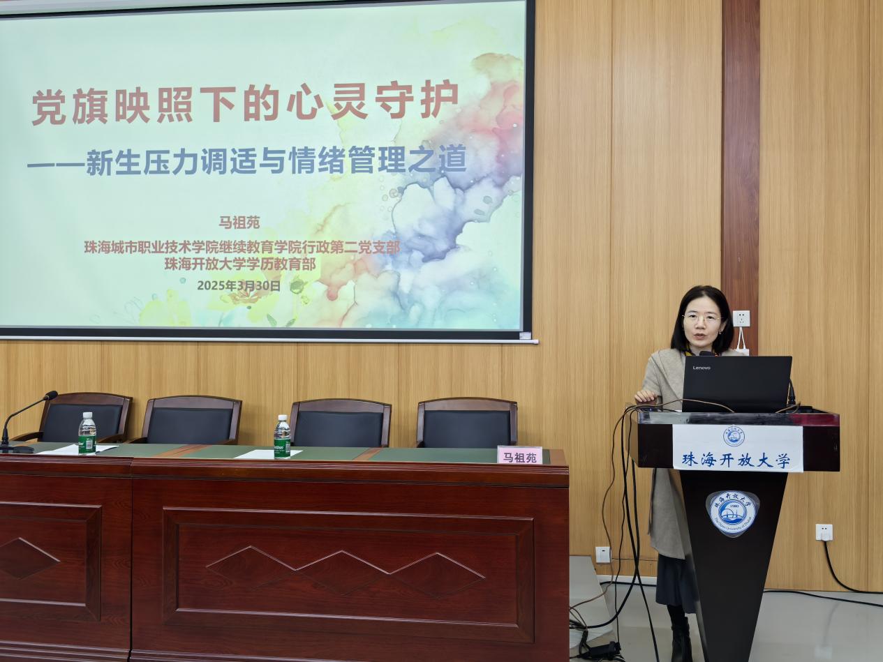 典礼结束后,学历教育部副主任马祖苑以《党旗映照下的心灵守护——新生压力调适与情绪管理之道》为主题给新生讲授了开学第一课。