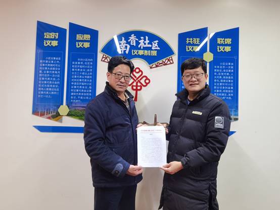 图一:狮山街道南香社区党委书记蔡斌超(右一)为我校送来感谢信