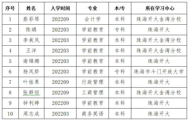 珠海开放大学2023年度国家开放大学奖学金入围名单