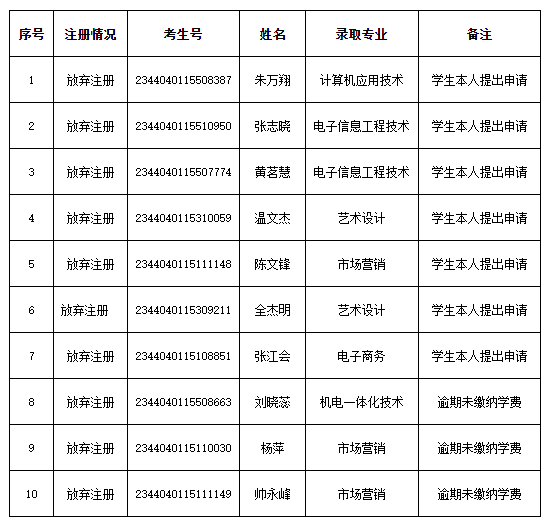 本学期初,我校成人大专2024级新生朱万翔等10名学生个人原因未在规定期限到校办理入学手续,其中,7名学生已提交放弃入学资格的申请,3名学生逾期未缴纳学费。根据《广东省成人高等教育学籍管理规定》和《珠海城市职业技术学院继续教育学院学生学籍管理办法(修订版)》第五条规定,经学校研究,拟同意朱万翔等10名学生放弃注册的申请。现将名单公示如下: